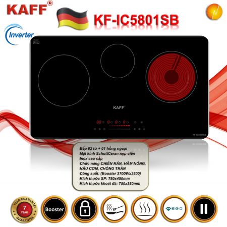 Bếp Điện Từ KAFF KF-IC5801SB sử dụng mặt kính Schott Ceran chịu lực chịu nhiệt tốt, tản nhiệt nhanh và chống trầy xước tốt. Bề mặt bếp được làm bằng mặt kính cường lực sang trọng, chống trơn trượt , chịu lực và chịu nhiệt lên đến 800 độ C, lực va đập là 30kg có màu xám lạ mắt, độc đáo, vùng nấu màu đen.